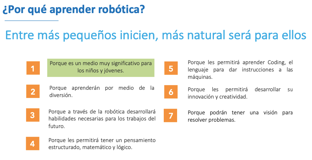 La robótica combina elementos que fomentan el desarrollo de habilidades de pensamiento indispensables para el desarrollo profesional en cualquier ámbito y va mucho más allá de crear robots y programarlos, adicionalmente incentiva el pensamiento lógico, la resolución de problemas y el trabajo en equipo a través de recursos tecnológicos.